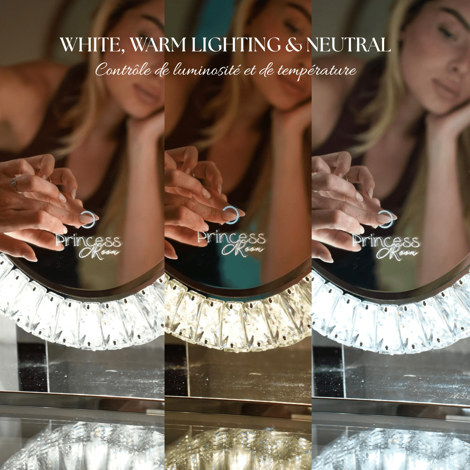 Sa forme ovale épurée, encadrée de luxueux détails en cristal, apporte une touche moderne et raffinée à n’importe quelle coiffeuse ou mur. Grâce à son éclairage LED réglable, il s’adapte à votre humeur et à vos besoins — que ce soit pour un maquillage précis ou pour créer une ambiance douce et apaisante.